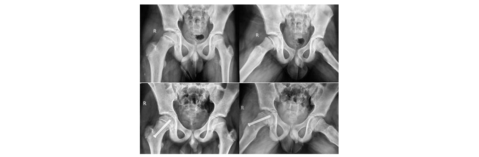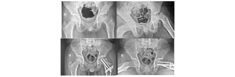 Figure 2: Showing pre-operative and post-operative xrays of severe (L) unstable SCFE treated with modified Dunn osteotomy showing excellent healing and no signs of AVN at 2 years follow-up